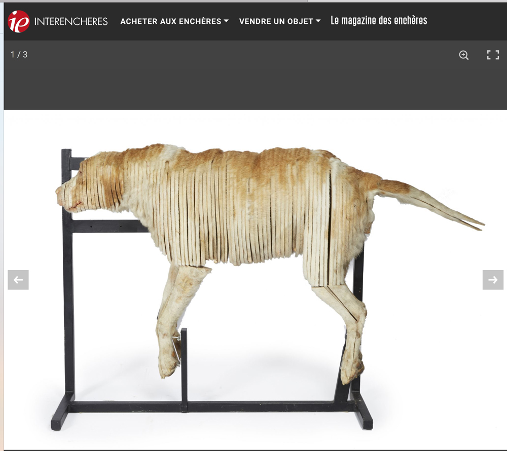 Le 9 novembre prochain sera proposé sur le site de ventes INTERENCHERES, un magnifique Golden Retriever découpé en 92 tranches, « lesquelles, nous dit-on, se feuillettent comme un livre. Toutes les parties sont amovibles et sont crochetées à une structure métallique laquée noire. »